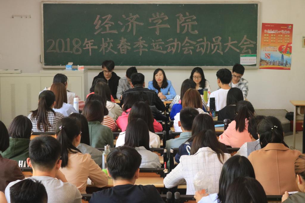 (通讯员:李雨桐 田永佳)4月18日、20日中午12:30,经济学院于舜耕、圣井两校区分别召开2018年校春季运动会动员大会。会议由经济学院正科级辅导员付雯老师主持召开,经济学院学生会全体成员、运动员、团体操队员、观众和方队负责人到场参加。