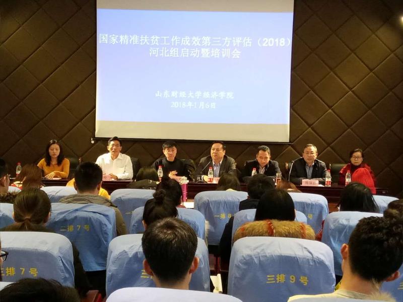 2018年1月6日,我校召开国家精准扶贫工作成效第三方评估重大任务(2018)河北组动员暨培训会,动员部署评估工作。山东财经大学校党委副书记车滨出席会议并讲话;山东省政府研究室宏观处调研员候西栋、经济学院副院长陈保启、经济学院党委副书记任海伦、仵颖涛出席会议;国家精准扶贫工作成效第三方评估重大任务(2018)河北评估组70名师生参加了会议;会议由经济学院院长、评估组组长董长瑞教授主持。