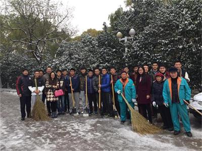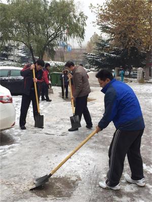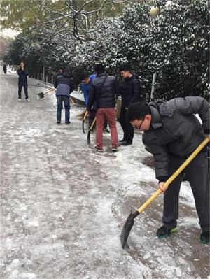 为保障广大师生出行安全,营造良好的校园环境,11月25日上午9点,经济学院积极响应学校号召,组织全院师生开展冬季扫雪活动。学院教师志愿者、研究生和本科生党员及入党积极分子、学生志愿者按照预案,在舜耕校区五号办公楼前集合,手持铁锹、木锨、扫帚开始清扫学院包干区的积雪。积雪虽然不厚,却在低温下冻结的非常结实,但这丝毫没有削减大家的工作热情,手和脸冻得通红,但仍热火朝天,干劲十足,每个人都苦在其中,乐在其中。在志愿者的齐心协力下,一个小时后,道路上的积雪全部被扫除干净。