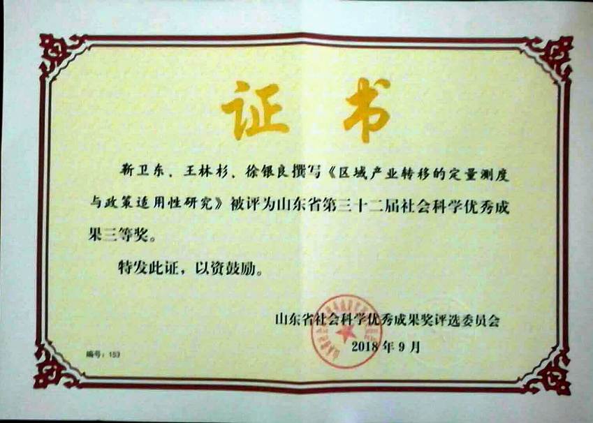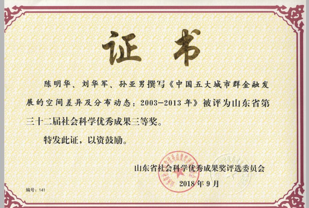 近日,山东省第三十二次社会科学优秀成果奖获奖成果公布,我院2项成果被评为优秀成果三等奖。分别是陈明华等撰写的《中国五大城市群金融发展的空间差异及分布动态:2003-2013年》、靳卫东等撰写的《区域产业转移的定量测度与政策适用性研究》,展示了学院教师的科研实力。
