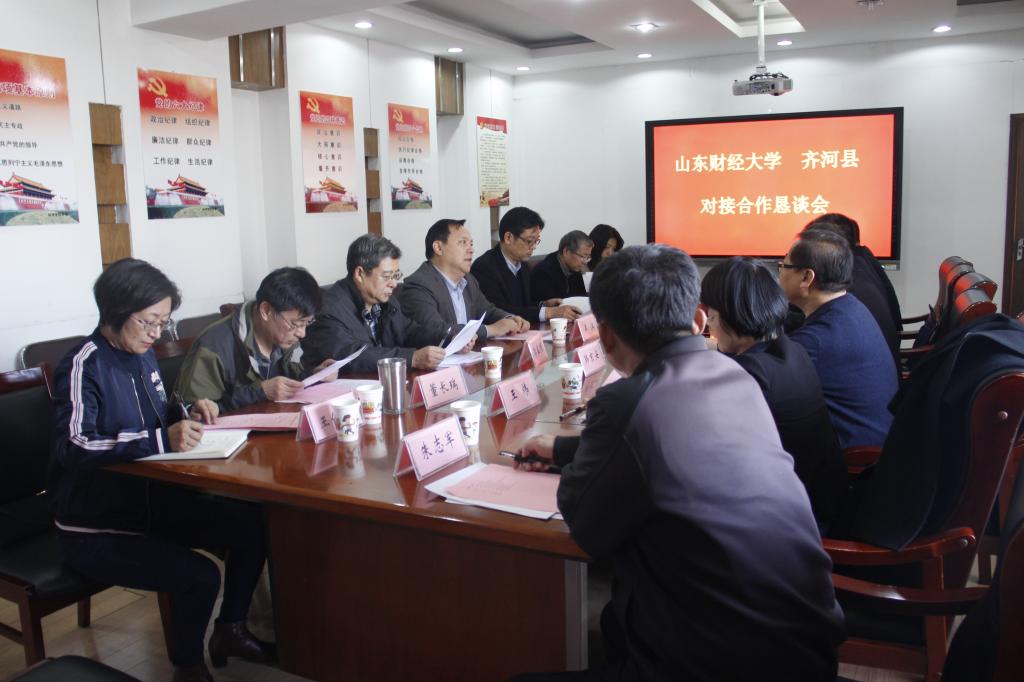2019年11月18日,山东财经大学与齐河县合作对接交流会在舜耕校区办公楼1208顺利举行。齐河县委副书记董庆新、齐河祝阿镇省派乡村振兴服务队队长韩京安一行7人,山东财经大学党委副书记车滨、机关党委书记李孟顺、经济学院党委书记姜伟、院长董长瑞教授和乡村振兴研究院负责人等8人参与本次会议,会议由姜伟主持。