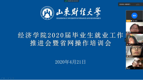 (通讯员:裴斐)4月21日晚上,学院利用腾讯会议平台召开2020届毕业生就业工作推进会暨省网操作培训会。经济学院党委副书记高峰,就业办主任裴斐,毕业班辅导员周新秀、李冰封、付雯和全体毕业生班长团支书参加会议。会议由付雯主持。