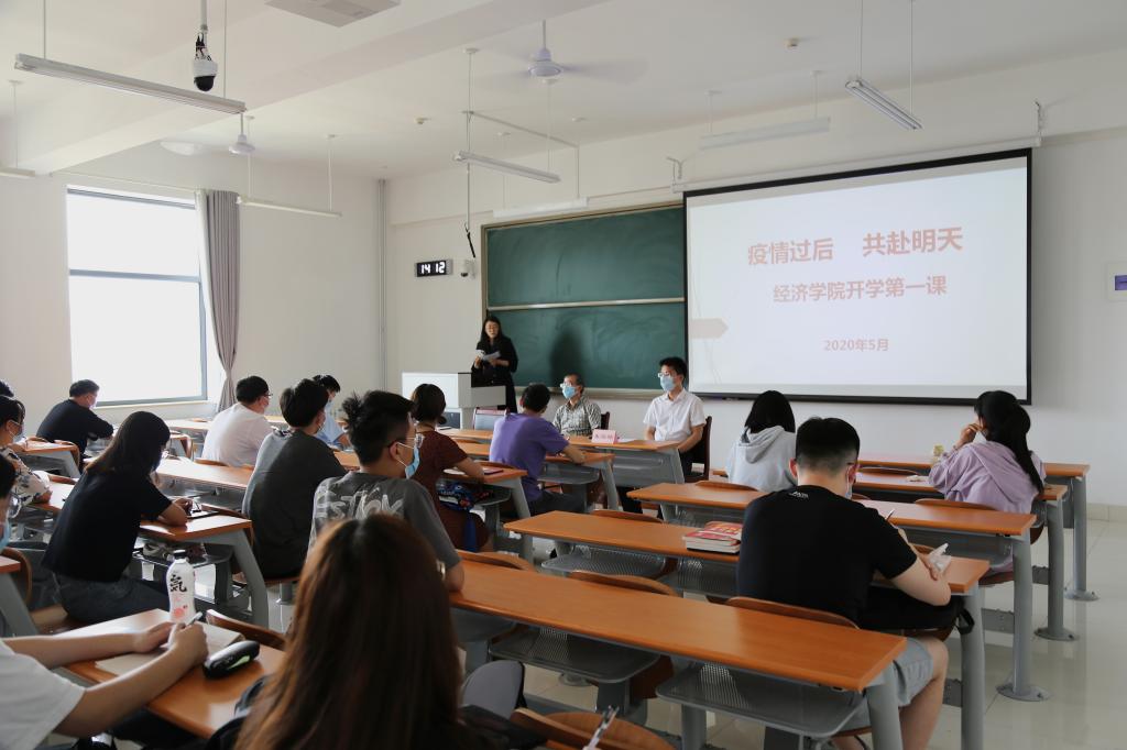 (通讯员:王琦、朱海林、王淑莹)为认真贯彻落实学校有关学生返校后的工作部署要求,做好疫情防控期间在校学生的管理工作,5月29日下午14:00,经济学院党委副书记高峰于圣井校区为我院返校学生上“开学第一课”,正科级辅导员王琦、辅导员朱海林参加会议,各班返校学生分为线下和线上两种方式聆听,会议由王琦主持。