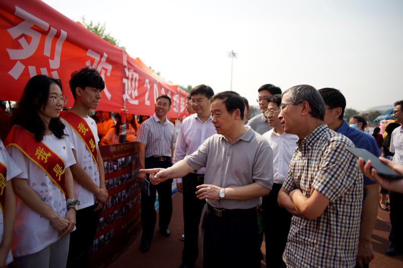 校党委书记王邵军、校长赵忠秀在学校相关部门陪同下莅临我院迎新现场,浏览学院迎新宣传板,询问学生报到情况,对我院迎新工作、党员服务岗的设立和现场宣传给予肯定。