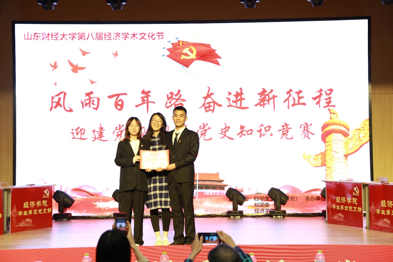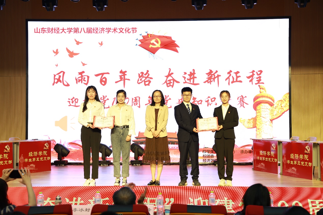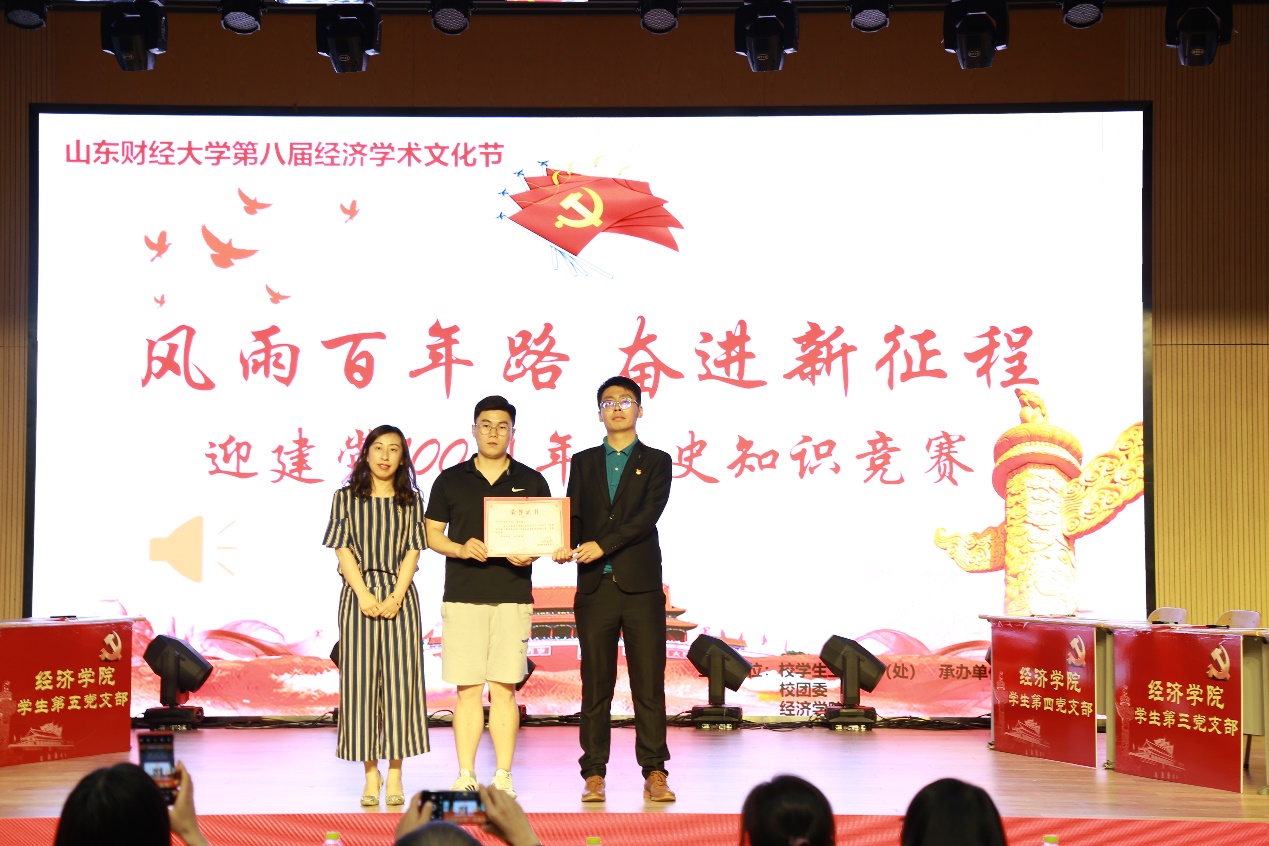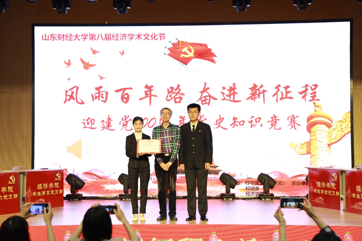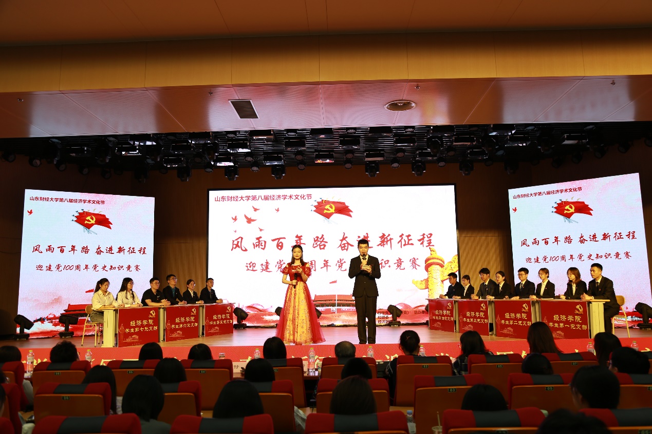 (通讯员:韩云昕 周佳妮)为庆祝中国共产党建党100周年,深入学习中国共产党从诞生到发展壮大的光辉历程和宝贵经验,了解在中国共产党领导下新中国发生的翻天覆地的变化,升华学生党员对党的认识,5月27日下午,经济学院于圣井校区文化活动中心举办“风雨百年路,奋进新征程”迎建党100周年党史知识竞赛。经济学院党委副书记高峰、李冰封莅临现场并担任评委,经济学院学工办主任裴斐、院团委书记付雯、党委专职组织员王琦出席,经济学院七个学生党支部分别派两名代表参加比赛,经济学院2018级预备党员、2019、2020级入党积极分子观看比赛。