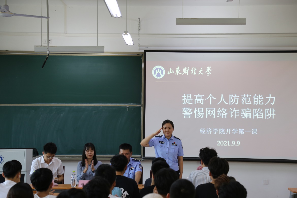 (通讯员:韩云昕)为预防新型电信诈骗,防止大学生被诈骗事件发生,打造安全、舒适、快乐的学习环境,9月9日下午,经济学院邀请章丘区圣井街道办事处派出所所长解学峰,副所长孟祥芳,街道办事处团委副书记魏山淼来校开展“提高个人防范能力,警惕网络诈骗陷阱”防诈骗宣讲活动,经济学院学工办主任裴斐,就业办主任朱海林出席会议,圣井校区19、20级部分同学参加会议。