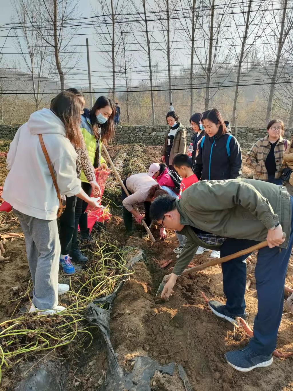 教职工们来到农田,就看到大片的蜜薯地,乡村空气香甜清冽,沁人心脾。勤劳的村民正在秋收劳作,一派繁忙景色。蜜薯的叶子经霜枯萎,覆盖在土垄上,蜜薯就藏在叶子下面的沙土里,老师们迫不及待地簇拥着来到地里,开始采挖活动,有“单打独斗”的,有互相合作的,带孩子的教工还抓住机会现场普及植物生长知识,场面十分热闹欢乐,大家充分体验到了劳动的乐趣。