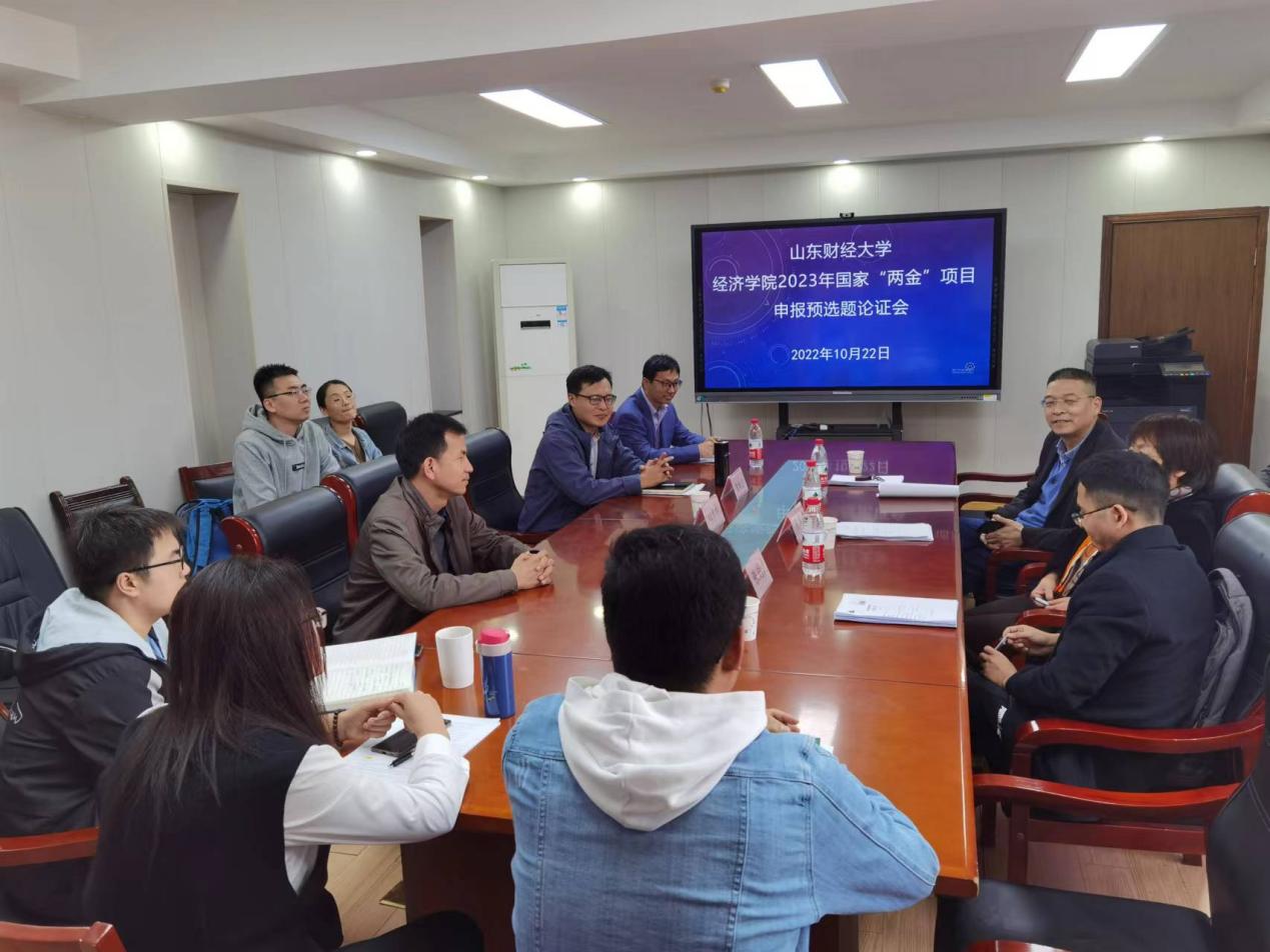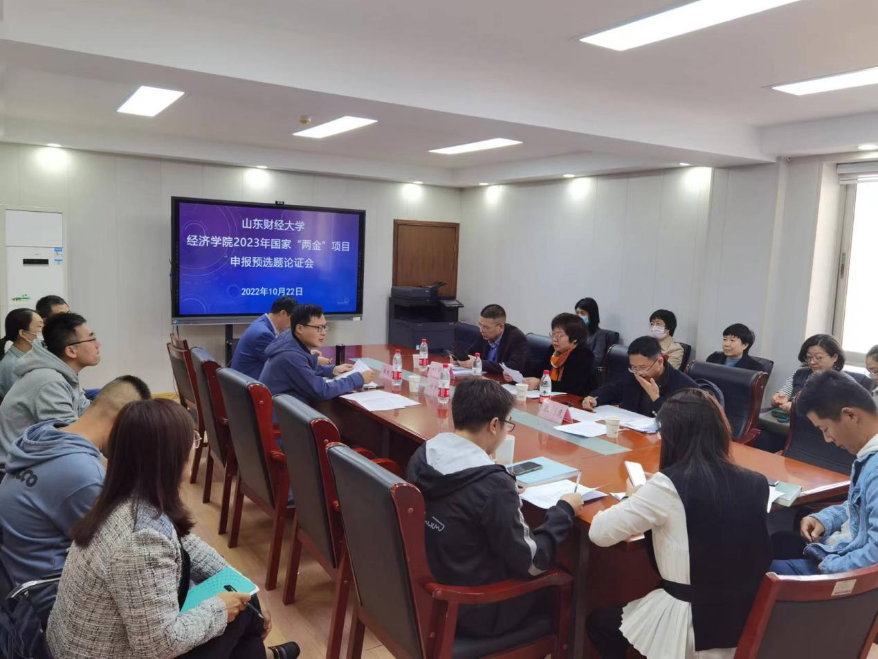 为进一步做好2022年度国家“两金”项目申报工作,提升我院教师承担重要科研项目的能力,2022年10月22日上午,由我院主办的2023年度国家“两金”项目申报选题论证会在舜耕校区办公楼1208会议室顺利举行。本次会议邀请到山东大学侯风云教授、张剑虎副教授及我院刘华军教授等学科领域内的专家。会议由谢申祥副校长和张明志副院长主持,拟申报国家“两金”项目的专任教师参加了此次会议。
