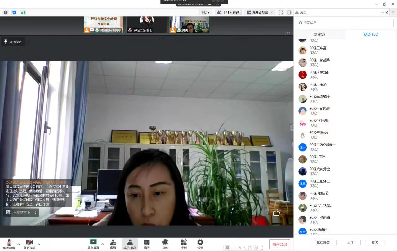 第三、严格防范网络电信诈骗教育。提醒同学们保护自己的信息安全,提高防诈骗意识,谨防冒充公检法诈骗、冒充熟人诈骗等,拒绝刷单,接到自称客服退款的电话及时找正规渠道核实,不在网上发布未经过求证的信息,不信谣不传谣。