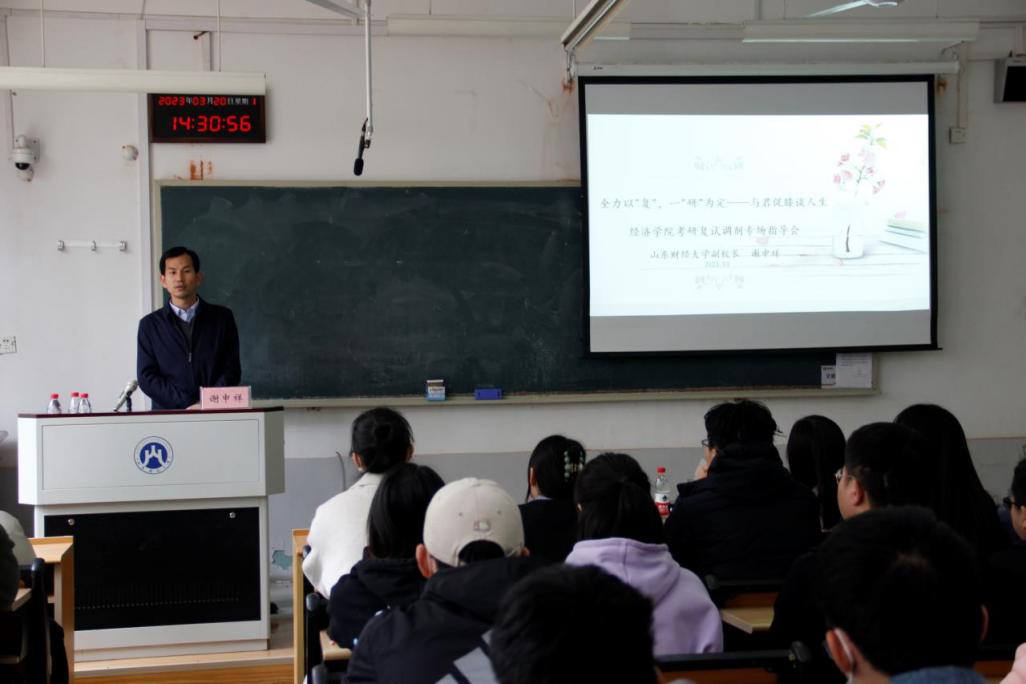(李冰封 裴斐 朱雅晴)为提升考研学子复试和调剂的技巧与能力,助力追梦学子成功上岸,3月20日下午,经济学院举办“全力以‘复’,一‘研’为定”考研复试调剂专场指导会。学院邀请山东财经大学副校长谢申祥进行交流指导,党委副书记李冰封、毕业班辅导员裴斐、王琦及2019级考研学生参加会议。会议由李冰封主持。