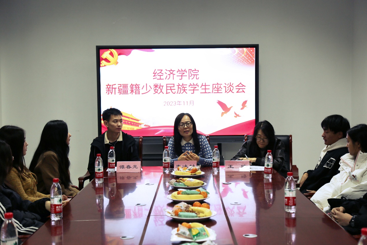 李冰封表示我院将按照习近平总书记“铸牢中华民族共同体意识”的民族主线,在学术文化节等活动中积极融入民族元素,增强经济学院各民族学生的情感联系。最后,她对新疆籍少数民族学生提出三点期望:一是要积极融入集体,团结友爱、互帮互助。二是要努力学习知识,打牢基础、提升自我。三是要遵守校规校纪,明辨是非,健康成长。