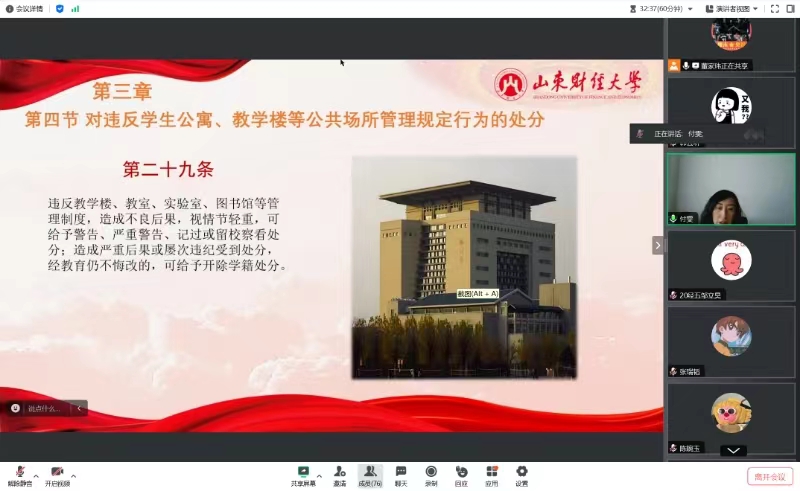 主题教育班会上,各班辅导员带领同学们系统学习《山东财经大学学生违纪处分条例》,详细介绍总则、处分的种类与适用范围、违纪行为与处分、处分权限和程序以及附则五部分的内容,重点对违纪行为与处分的五个章节逐条阐述,从危害国家安全与公共安全、扰乱社会秩序校园秩序网络秩序行为、侵犯人身权利公私财产行为、对违反学生公寓教学楼等公共场所管理规定行为和对违反学习、学术、考试纪律行为进行逐条学习重点解读,结合相关典型案例,给同学们强调了维护校园秩序、网络秩序、公寓消防安全、人身财产安全的重要性以及注意事项。临近期末考试,辅导员重点强调了《山东财经大学学生违纪处分条例》中的考试违纪行为,嘱咐同学们端正考试态度,严格遵守各项考试纪律,同时引导同学们合理规划期末复习,靠自己的努力取得优异成绩。
