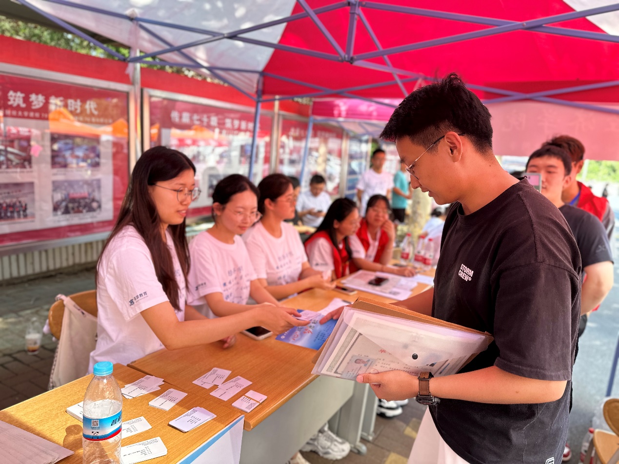 报到处志愿者为远道而来的新生提供周到贴心、细致温馨的服务。用最简化的流程、最暖心的关怀,高效顺畅地为新生办理报到手续,有条不紊地为新生及家长提供咨询服务,为其答疑解惑。
