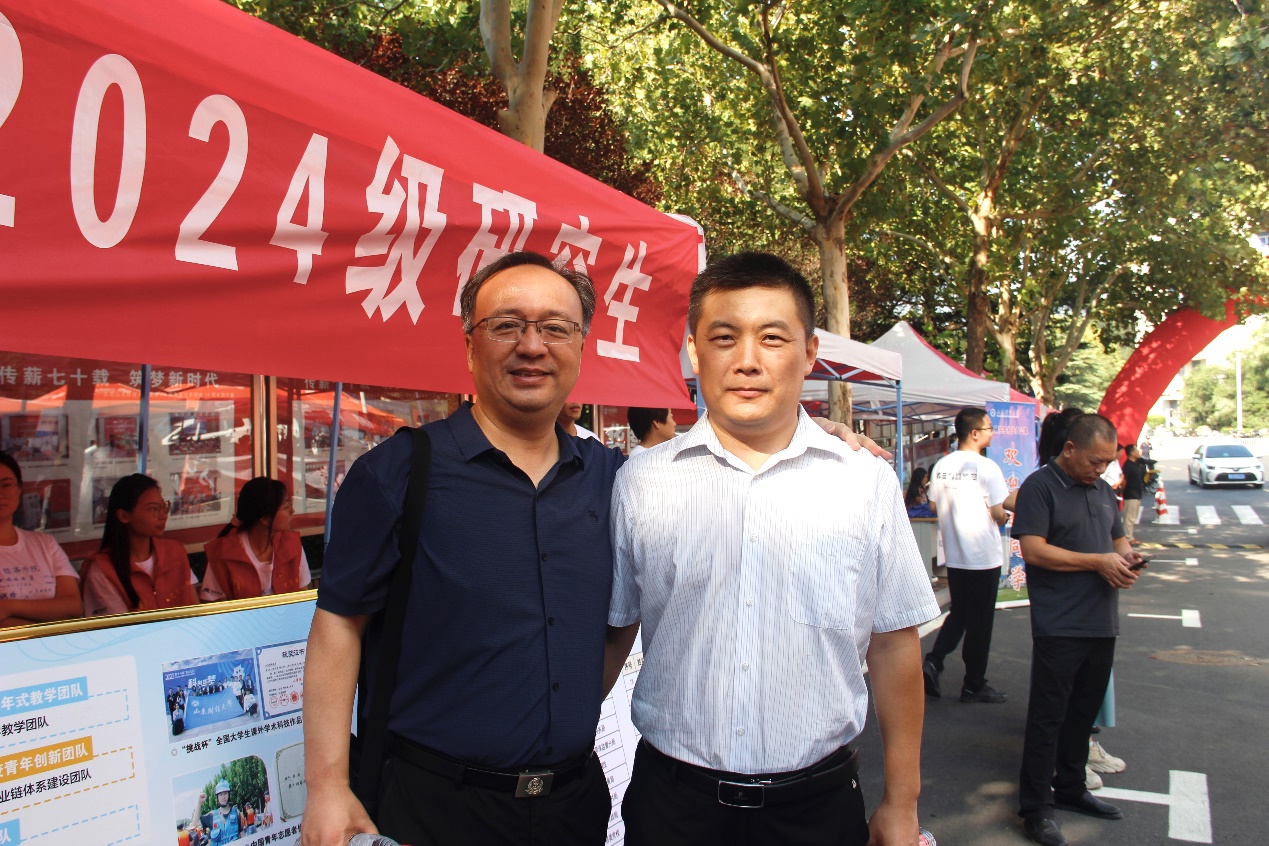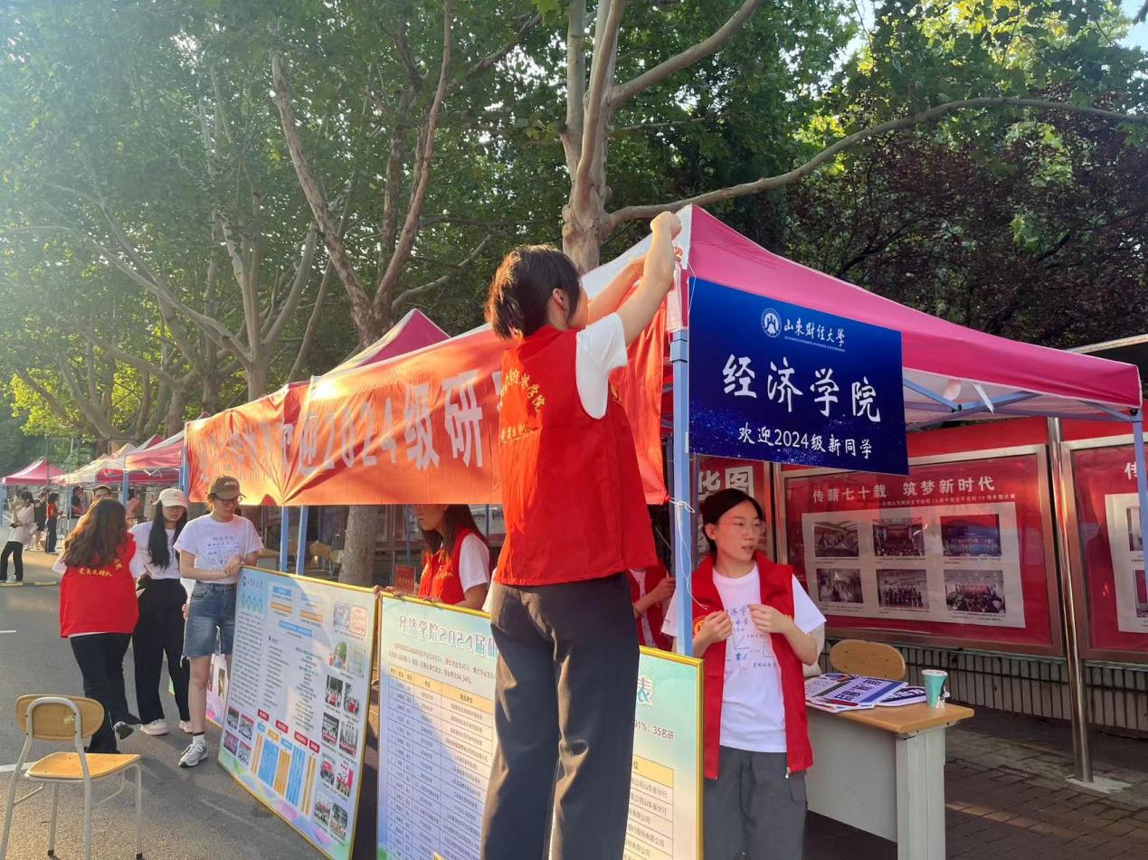 晨光熹微,学院研究生会各部门积极筹备,搭帐篷、拉横幅、搬桌椅,井然有序迎接新同学的到来。
