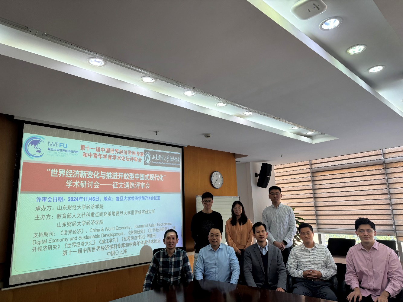 注:第一排(从左至右):复旦大学王弟海教授、复旦大学沈国兵教授、山东财经大学谢申祥教授、复旦大学李志远教授、复旦大学赵腾宇助理教授。第二排(从左至右):复旦大学唐东波副教授、记录员复旦大学经济学院张梦雪博士生、复旦大学张志杰博士后。