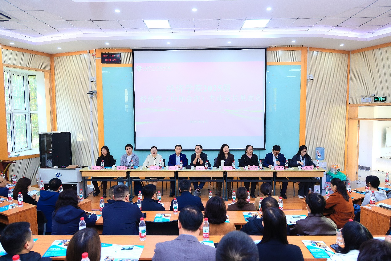 经济学院党委副书记李冰封、副院长崔宝敏、教授代表杨丽、2025级中加班辅导员秦小晴,以及经济学院2025级经济学(中加合作)专业全体家长和学生参加了见面会。