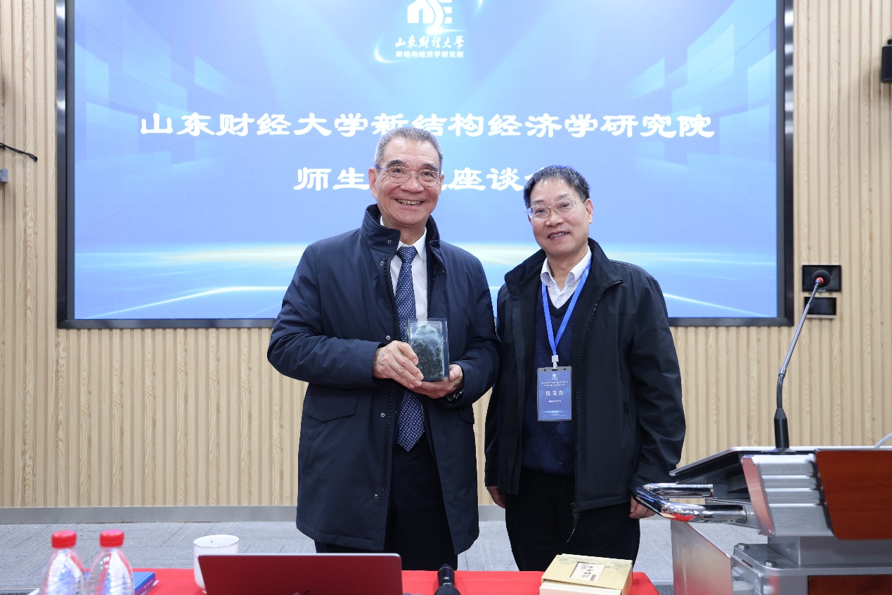 最后,殷克东向林毅夫赠送了精美礼物,并向林毅夫教授表示感谢。新结构经济学实验班同学代表向林毅夫和王勇献花,表达了崇高敬意�