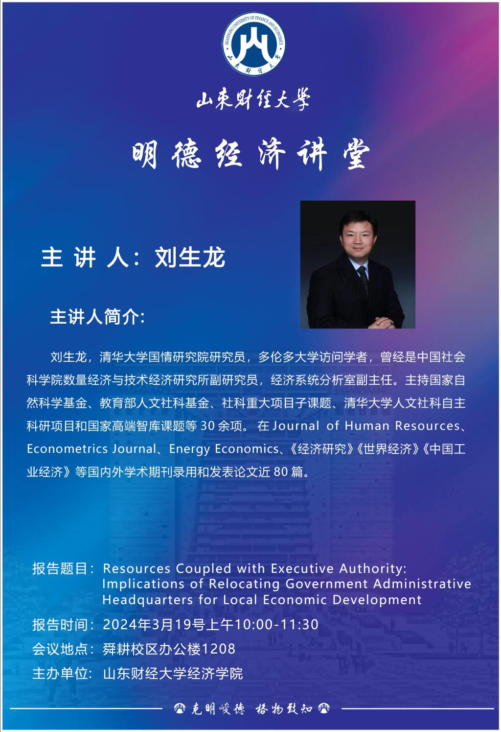 山东财经大学明德经济讲堂:Resources Coupled with Executive Authority:Implications of Relocating Government AdministrativeHeadquarters for Local Economic Development