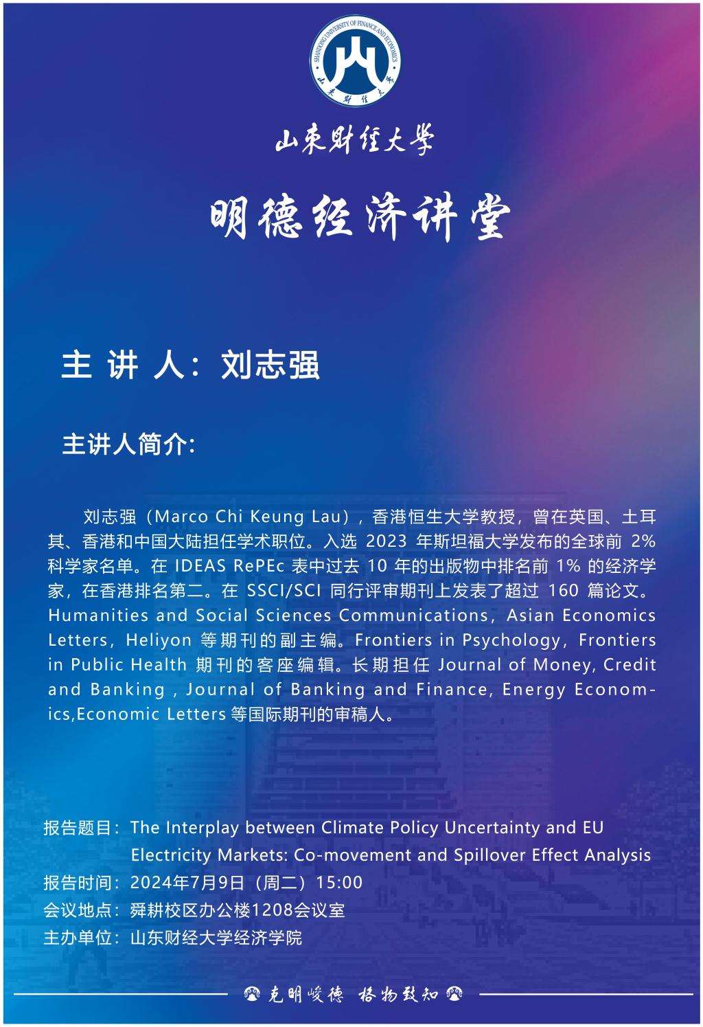 山东财经大学明德经济讲堂:The Interplay between Climate Policy Uncertainty and EU Electricity Markets: Co-movement and Spillover Effect Analysis