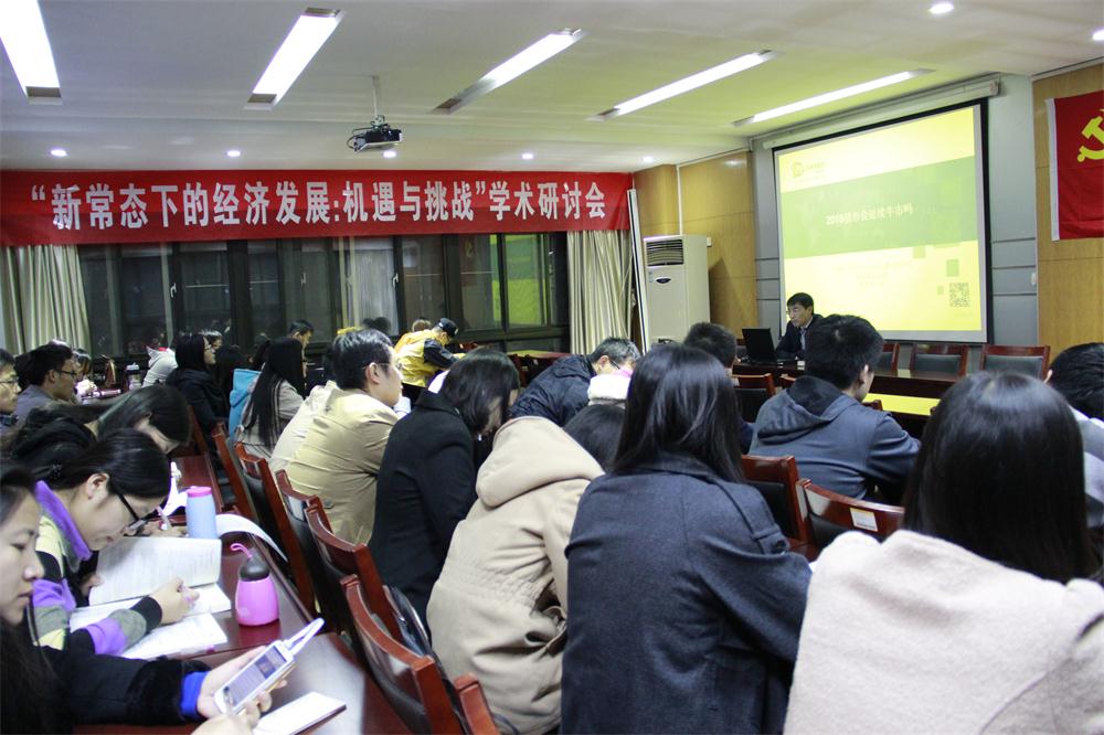 1030日晚上7:30, 中国人民大学经济学博士,现任中诚信国际研究咨询部总经理,主管中诚信国际博士后工作站及部门工作的张英杰教授在舜耕校区天舜大厦600会议室作了题为“2015债市会延续牛市吗 ?——降息后收益率反升,存量债务如何置换”的精彩讲座。讲座由经济学院副院长王传荣主持,部分老师和学生到场聆听。