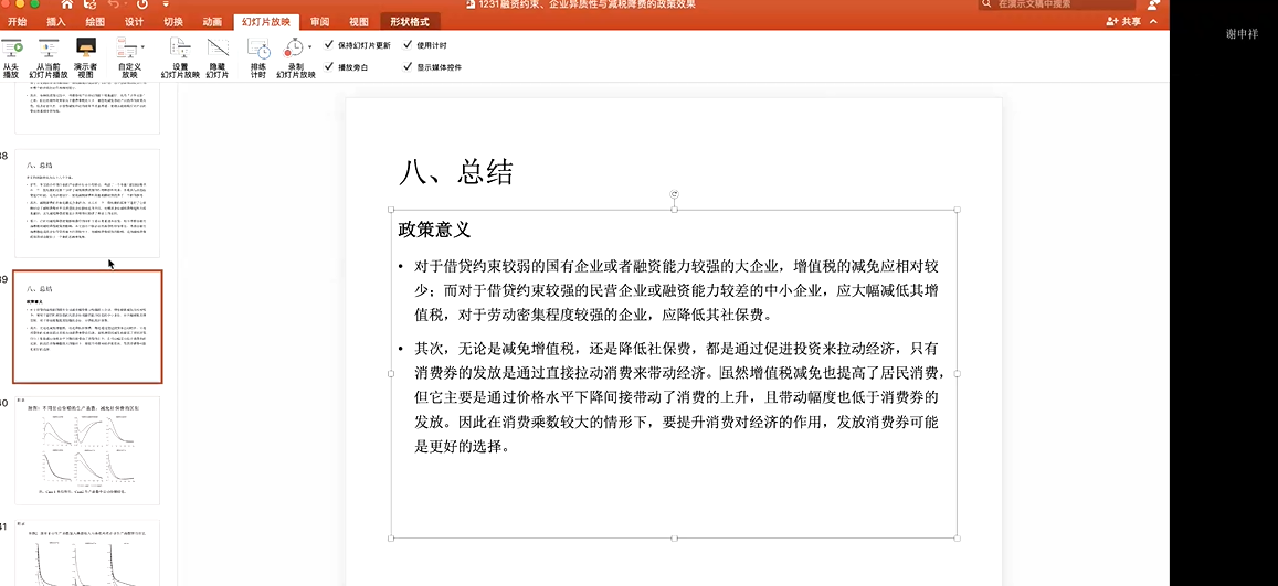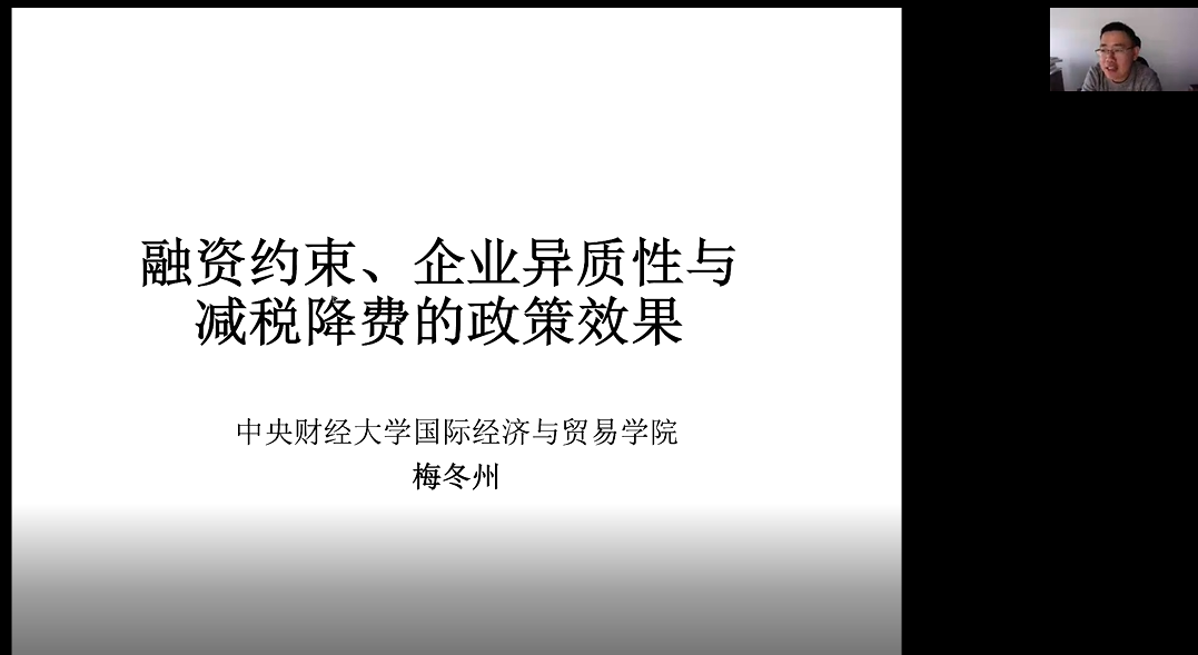 本次论坛的主题是“融资约束、企业异质性与减税降费的政策效果”,围绕这一主题,梅冬州教授从减税降费的背景、文献综述、模型、政策分析和总结几个方面展开论述,重点介绍了企业异质性和减税降费的核心概念。基于两个核心概念,梅冬州教授构建DSGE模型,通过参数的校对和估计,运用脉冲分析和政策分型来得出政府减费降税对企业的影响及作用效果。最后,梅冬州教授对减税降费提出了理论支持和政策建议。他建议用经济学的方法和视角来研究我国财政税收问题,既要研究一般的经济活动,同时也要研究财政税收活动。
