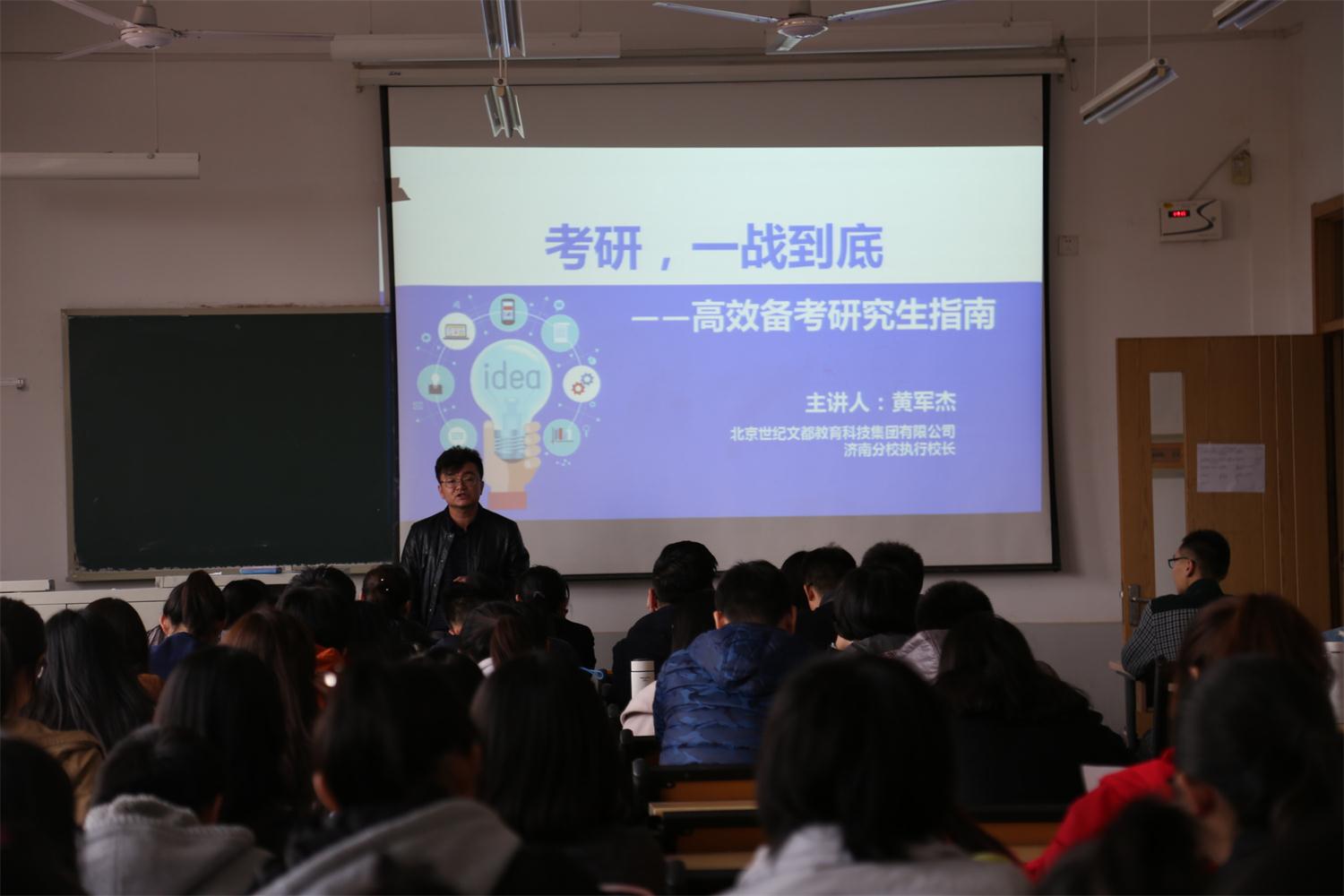 (通讯员:杨晶、刘如玉)11月17日下午2:00,经济学院于舜耕校区1404教室举办“考研,一战到底——高效备考研究生指南”讲座,北京世纪文都教育科技集团有限公司济南分校执行校长黄军杰主讲,我院14、15、16级部分同学参加,我院正科级辅导员付雯主持。