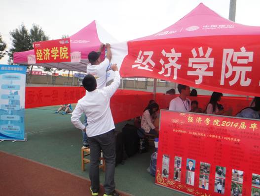 9月11号早上6点,我院学生会工作人员已早早来到圣井校区操场上,迎新的准备工作正在紧锣密鼓地进行。按照《经济学院2014级迎新工作方案》的要求,我院各工作人员恪尽职守,各负其责,通力合作,做好帐篷搭建、展板布置、物品运送、桌椅摆放、报到资料整理等工作,高效有序地保障了迎新工作的顺利启动。
