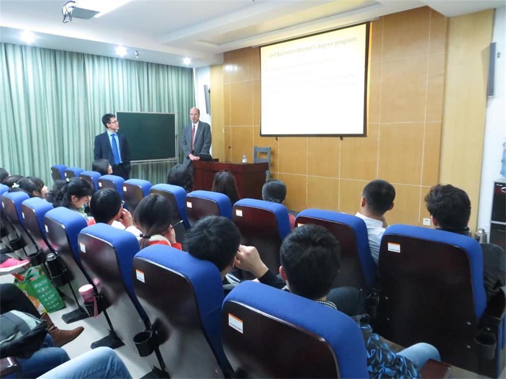 Mark Severson教授首先向大家详细介绍纽约州立大学布法罗州立大学的专业、学位设置,发展状况,本科生和研究生培养的课程体系、模式与特色,以及布法罗州立的地理位置和校园风光,并全面细致讲解与我院合作的“3+2留学项目相关事宜。随后,他重点介绍了经济和金融部门、应用经济学的硕士项目,课程设置及师生培养方式。
