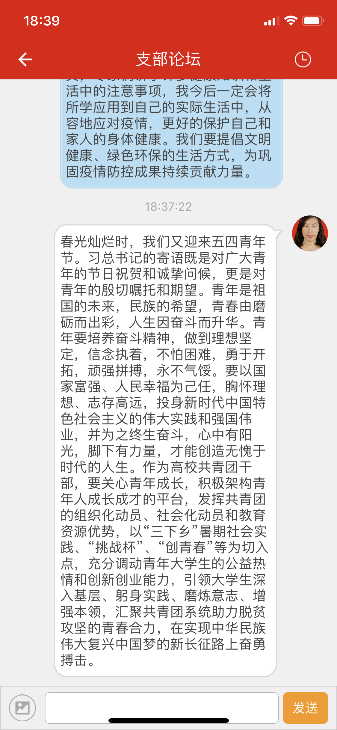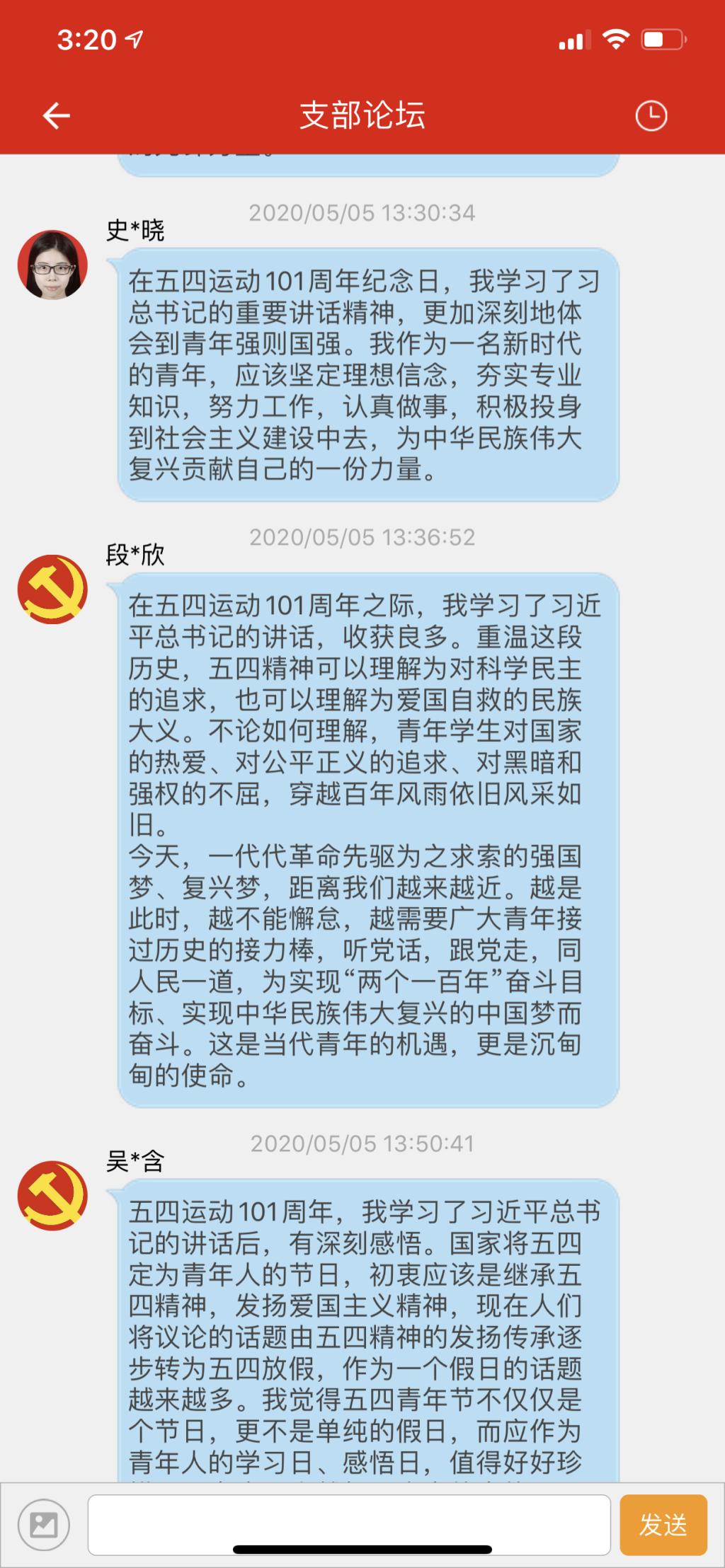 目前仍处于疫情防控的关键期,党员学习的场地从现场改为线上,但是大家的热情没有任何改变�会上,各支部书记首先向青年党员送上了节日的祝福,激励大家做有理想、有本领、有担当的新时代青年,为实现中华民族伟大复兴的中国梦而奋斗。随后大家深入学习了习近平总书记五四寄语�在纪念五四运�100周年大会上的重要讲话精神,重温了习总书记的青春故事,以及习总书记历年来“五四讲话”中的经典语录。党员同志们结合学习和实际情况在线进行了充分的交流和讨论。教工党员李冰封深情地说:“虽然我已经过了青年的年龄,但是我一直拥有着青年的心态,愿意绽放自己的青春,为国家培养更多的人才”;即将成为一名西部志愿者的学生党员王克轩表示,立志去祖国最需要的地方去,建功立业,实现青春梦想;王振欣向支部党员分享了抗疫期间担任志愿者的体会,疫情爆发后,她帮助社区宣传普及抗疫知识,为防控执勤点捐赠物资,坚守工作第一线,并帮助解决辖区村民的困难……用青春的热血实现了一名青年党员的担当�