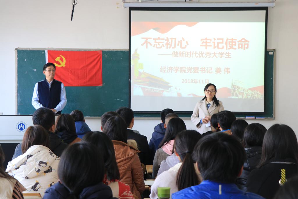 (通讯员:李冰封 朱海林 杨晓雯 于小桐)为深入贯彻习近平新时代中国特色社会主义思想和党的十九大精神,11月22日下午,经济学院党委书记姜伟在圣井校区敏行楼B5302为我院学生上党课。辅导员朱海林,全体入党积极分子和2017、2018级主要学生干部聆听了此次党课。经济学院党委专职组织员李冰封主持此次党课。