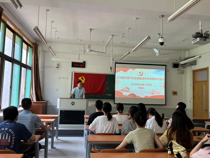 为深入学习贯彻习近平新时代中国特色社会主义思想主题教育,落实党的二十大精神,6月20日下午,经济学院副院长张明志给经济学院学生第八党支部讲授了一堂以“以中国式现代化全面推进中华民族伟大复兴”为主题的党课。经济学院学生第八党支部全体党员参加会议。