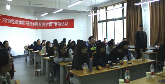 为了拓宽研究生学术视野,促进朋辈交流,发挥榜样引领作用,由山东财经大学党委学生部主办,经济学院研究生会学术调研部承办的经济学院“研究生国奖面对面”专项活动于2019�11�12日在舜耕校�2号教学楼2302教室举办。活动邀请了国家奖学金获得者吕杰、雷名雨、刘玉鑫三位同学来分享自己的学术经验,并邀请经济学院讲师贾庆英担任点评教师�2018级�2019级研究生参与了此次活动�