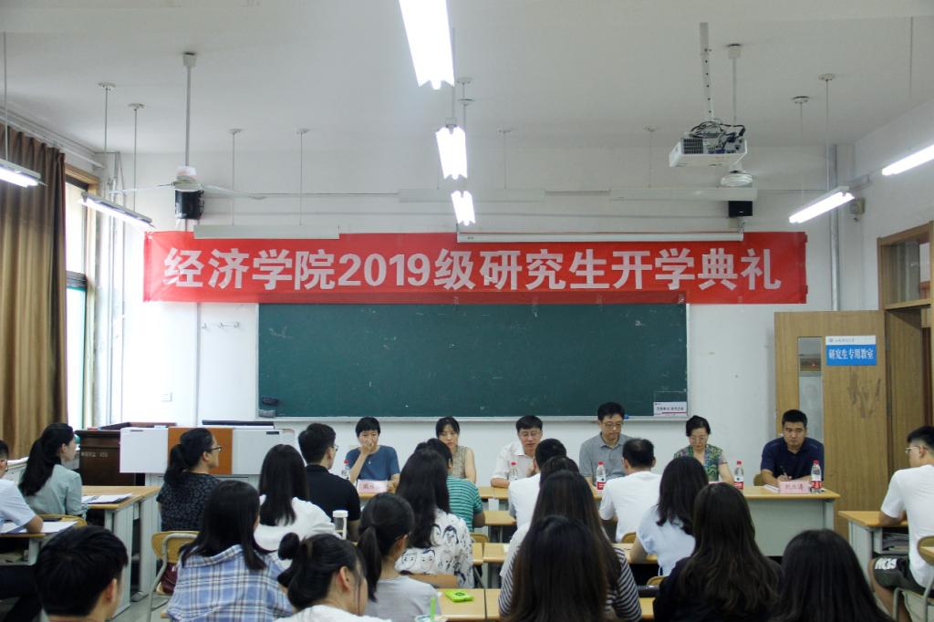 2019�9�5日下午,经济学院2019级研究生开学典礼于舜耕校区教学楼3303教室隆重举行,院长董长瑞,党委书记姜伟,党委副书记仵颖涛,副院长彭留英,学工办主任、研究生辅导员周新秀,研究生秘书刘应涛和教师代表藏传琴出席会议,2018级全体研究生到场参会,会议由仵颖涛主持�