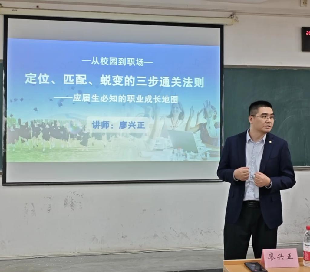 廖兴正围绕“定位� “匹配� “蜕变”三个环节,首先强调“定位”的关键意义,分析个人的工作价值观,以九种职场人格为例,引导学生深入探索自我,找到自己的“职场指南针”;在“匹配”环节,他指出需从企业分类以及企业发展各阶段对人才需求入手,洞察和看懂企业的“生命周期”,深入了解企业文化,选对自己的发展赛道;在“蜕变”环节,他提出要认真剖析学生与职场人的区别,实现从学生思维到职场人思维的转换,鼓励学生摒弃被动等待任务的习惯,主动发现并解决问题,学会团队协作与利益交换,接受工作中的灰度决策。他详细阐述了骨干进阶三部曲,即站稳——冒尖——带队,提出要避免“职场电池”报废,通过不断技能更新和磨砺管理能力提高职场续航力�