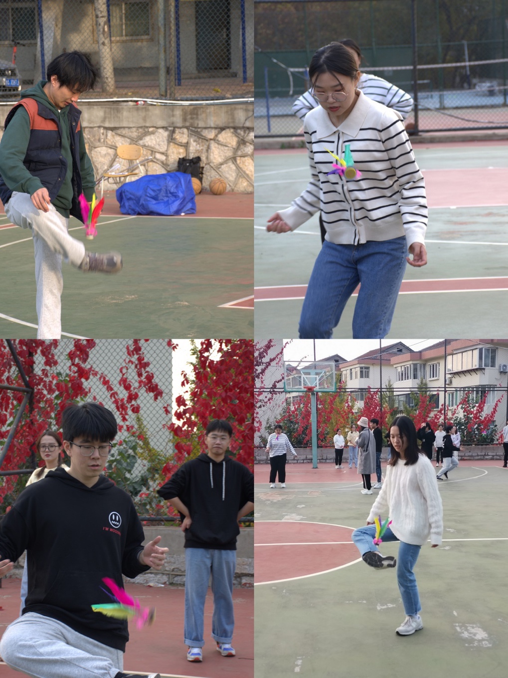 毽子接力为踢毽子接力赛,成员之间轮流踢毽子,以总数作为队伍最终成绩。大家相互配合,在轻松欢笑中完成比赛�