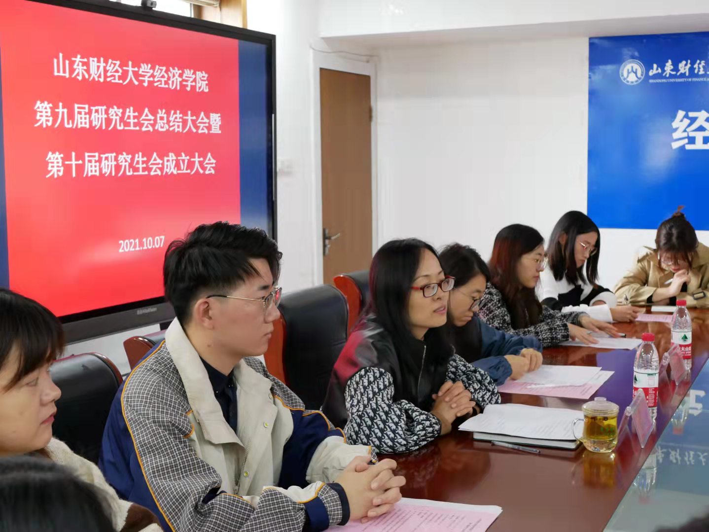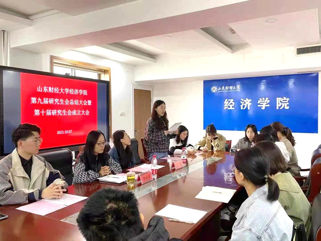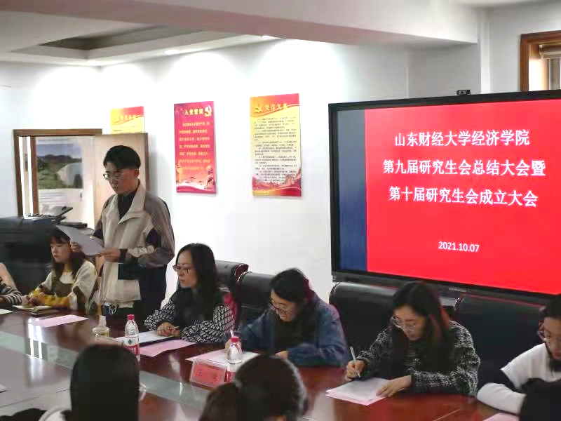 (通讯人:孙慕容)2021�10�7日下�14�30,经济学院第九届研究生会总结大会暨第十届研究生会成立大会于舜耕校区办公楼1208举行。经济学院党委副书记李冰封,党委专职组织员王琦出席会议。第九届研究生会主席孙影及第十届研究生会全体成员参加会议,会议由曹静静主持�