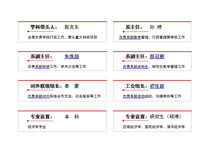 目前,国民经济学系有专任教师24人,其中,教�6人、副教授11人、讲�7人;博士生导�3人、硕士生导师12人,形成了一支结构合理、学术实力雄厚、开拓创新能力强的高水平师资队伍。拥有“国家万人计划”哲学社会科学领军人�1人,中宣部文化名家暨“四个一批”人�1人,国务院政府特殊津贴专�1人,山东省社会科学名�1人,山东省泰山产业领军人�1人,山东省“泰山学者”青年专�2人,山东财经大学海岱学者拔尖人才和海岱学者骨干人�2人�